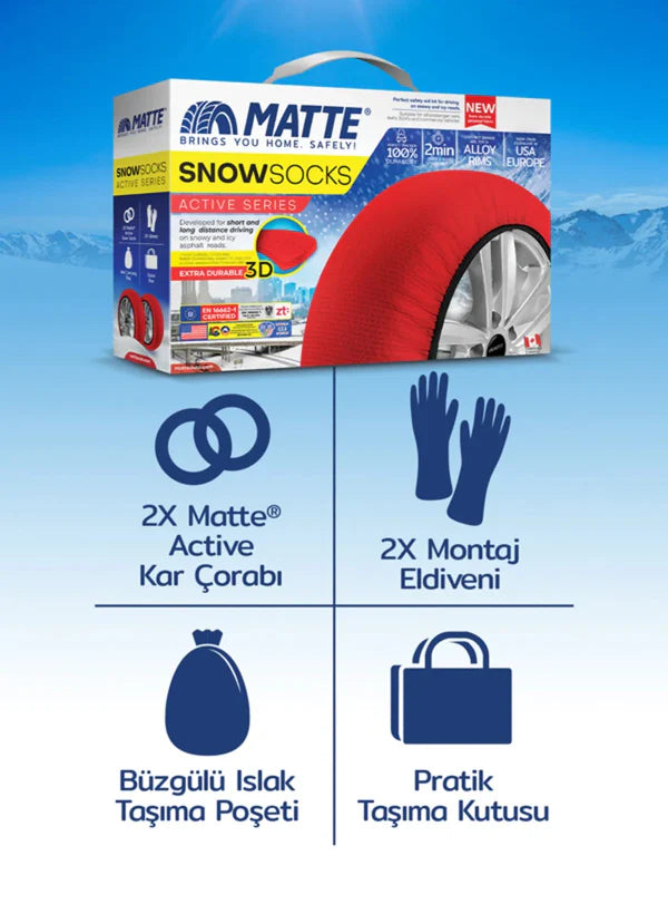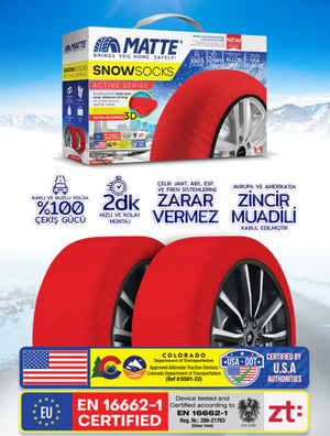 Karlı ve Buzlu yol koşullarında eşsiz yol tutuşu ve direksiyon hakimiyeti sağlayan Kar Çorapları, yola tutunma özelliği ve dayanıklılığı son derece yüksek ileri teknoloji tekstil ürünlerinden imal edilmiştir.