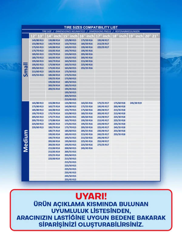 Araç lastik ebatlarınıza göre beden seçimi yapınız, görsellerde bulanan lastik ebatlar tablosuna bakarak aracınıza uygun bedeni seçiniz